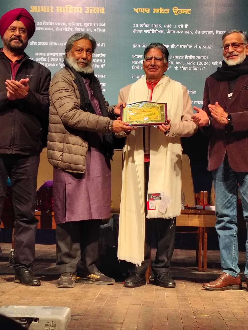 प्रख्यात साहित्यकार एस आर हरनोट को वर्ष 2024 के आधार साहित्य सम्मान से नवाजा गया है। पंजाब कला भवन के विशाल रंधावा सभागार में शनिवार को आधार साहित्य उत्सव के अवसर पर एक भाव समारोह में यह सम्मान दिया गया। वर्ष 2025 का आधार सम्मान कथाकार जयशंकर को मिला।